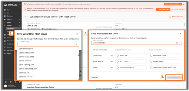 - Kapag pinili ang opsyong ito, lalabas ang listahan ng mga existing na Fleet driver kung saan maaari kang pumili ng driver upang pag-isahin ang kanilang data.